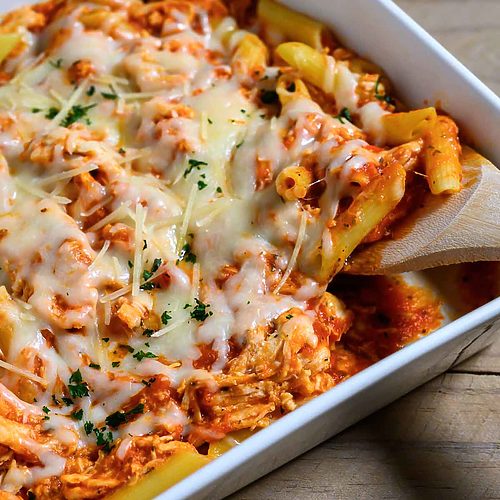 This easy 5-Ingredient Penne Pasta combines shredded rotisserie chicken, marinara sauce, mozzarella cheese, and Italian seasoning with penne pasta, or your favorite shaped pasta.