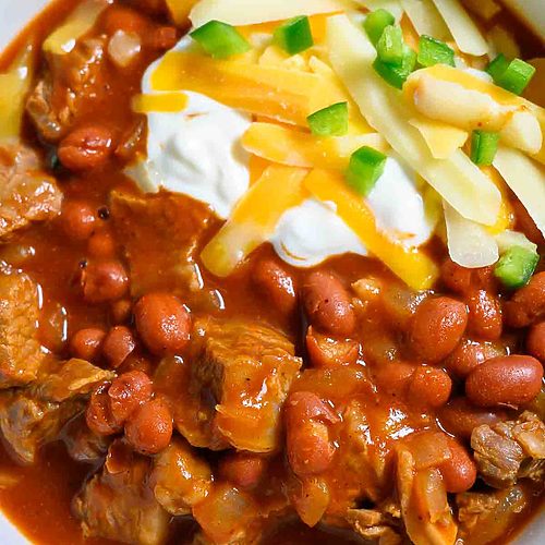 - In a 6-quart crockpot slow cooker, add the steak, onions, tomato sauce, chili beans, garlic salt, chili powder, beer, and cumin and stir.