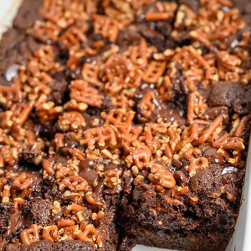 - Sprinkle the chocolate chips over the top of the cake batter, followed by the broken pretzel pieces, and then drizzle the caramel over the top.