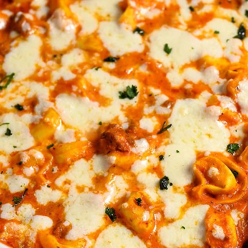 Ground Beef Tortellini has lean ground beef mixed with Italian seasoning and garlic. It also includes pasta sauce, tortellini, cream cheese, and mozzarella. The dish is baked until it is melted and golden brown.